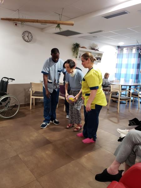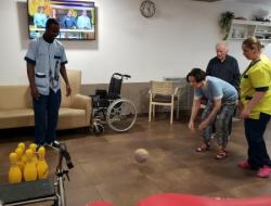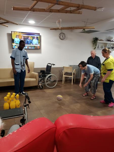 Qu’à cela ne tienne, les parties de bowling pour garder la forme et le plaisir de jouer se déroulent à l’intérieur à la fraîcheur de la climatisation! Les quilles sont mises en place, et les résidents sont impatients de lancer leur boule! Qui va réussir le strike du jour! des gestes qui reviennent aussi vite que de monter sur un vélo. De jolis moments qui apportent des rires , des cris de joie et un petit esprit de compétition qui ne fait pas de mal!