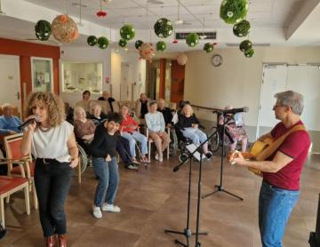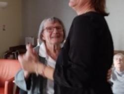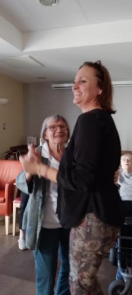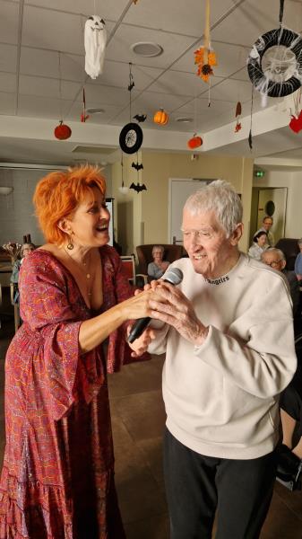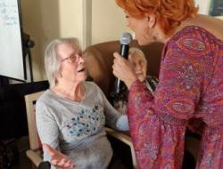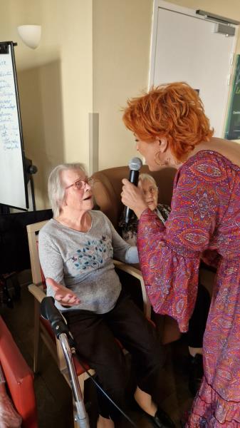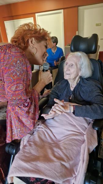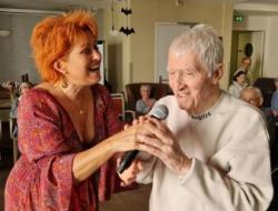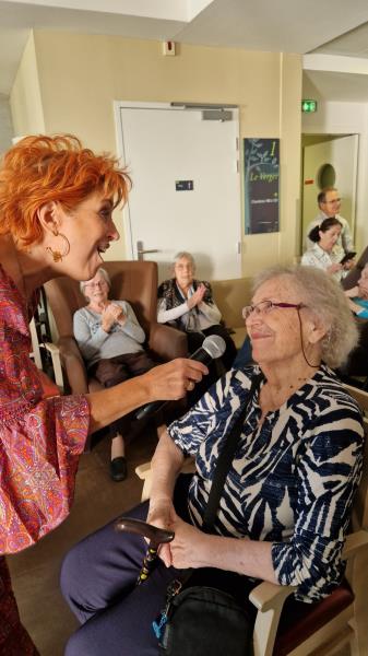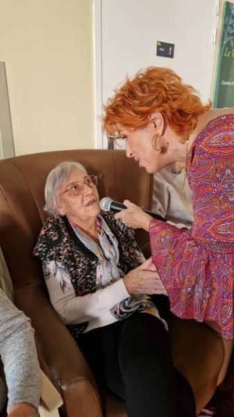 Les résidents ont eu la chance de fêter les anniversaires du mois d’octobre avec Michelle qui a bien voulu revenir nous voir et remplacer au pied levé l’intervenant qui nous a annulé au dernier moment! Nos pensionnaires n’ont pas perdu au change car ils ont pu apprécier la délicieuse présence de Michelle , son aura solaire qui a illuminé l’ambiance. Avant le show, l’artiste a pris le temps de discuter avec nos résidents et de leur dédicacer des chansons, un geste généreux qui mesure la qualité humaine de Michelle Molinari.