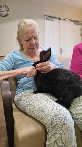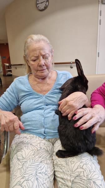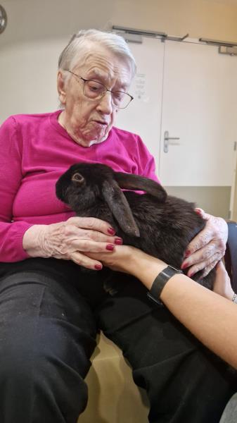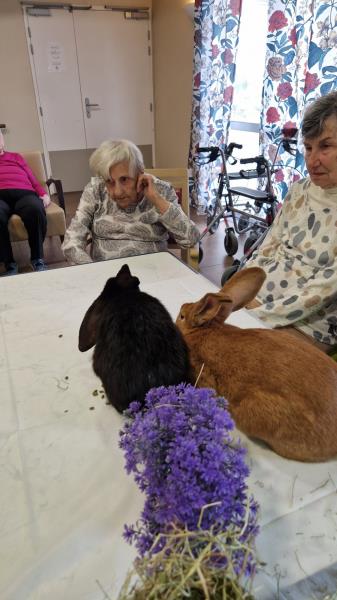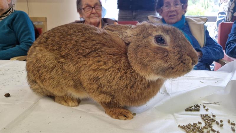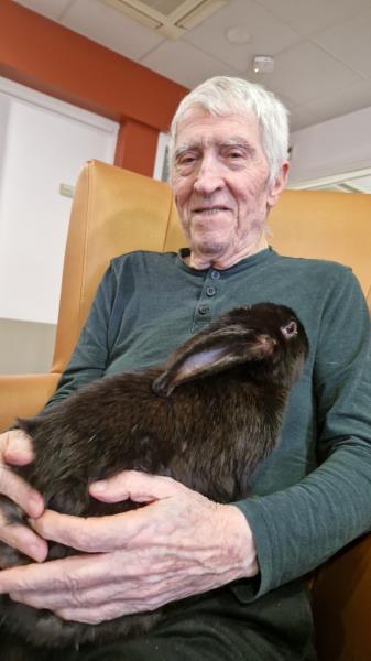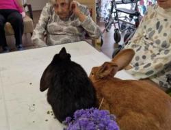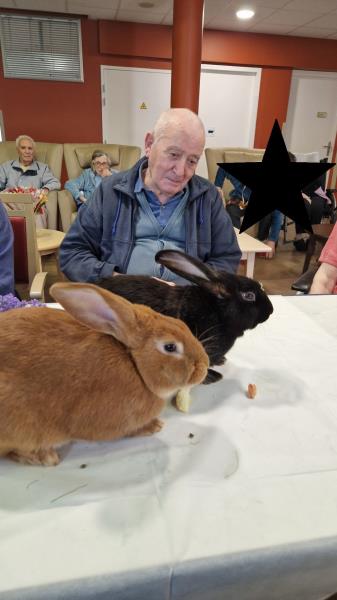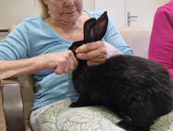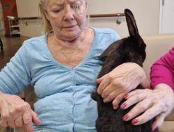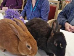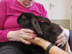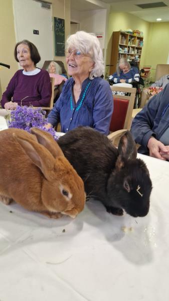 Une fois de plus la surprise a été grande! Bérénice de l’association les cavaliers du cœur nous a proposé un atelier de groupe avec ses bébés lapins. Derniers arrivés dans leur petite ménagerie ils ont fait sensation auprès de nos résidents! Ne serait-ce que par leur taille! Agés de 4 mois ils dépassent déjà de très loin la taille des habituels lapins de compagnie. Un géant des Flandres, un lapin papillon noir , et un roux de bourgogne! De nature paisible ils sont les lapins idéaux pour la médiation animale! Un régal pour les yeux et pour les câlins!