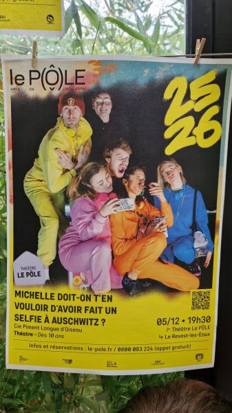 Nous partîmes sept et nous sommes arrivés 250! Et oui nous avons rejoint deux cents collégiens pour assister à la pièce de théâtre « Michelle doit-on t’en vouloir d’avoir fait un selfie à Auschwitz? ». Un thème d’actualité à l’heure des réseaux sociaux . Une histoire vraie qui pose la question , peut-on se photographier n’importe où? Cela a t-il des conséquences sur notre vie ou celles des autres? Un thème traité avec beaucoup d’humour et intelligence, où une grande partie du public s’est sentie concernée!